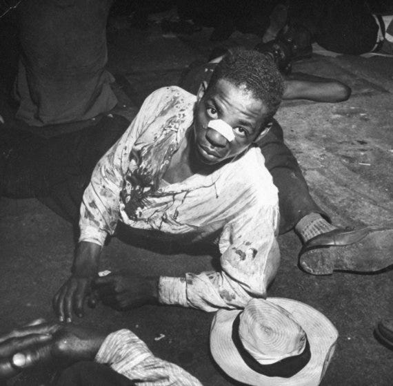 Of course, if one accepts the notion that the actions of Aaron Fox and Charles Lyons on Belle Isle were responsible for all of the whites who formed enormous mobs around Woodward Avenue, then one has to assume that whites were equally responsible for the actions of Fox and Lyons. This is because on June 15th an “incipient race riot” between “several hundred teen-age zoot-suit battlers” at Eastwood Park took place after some 200 white youths, and white servicemen, forcibly ejected all blacks from the park and attacked those that refused to leave.13 The police arrested 18 youths and put 10 on trial — and it was telling that all of those arrested were white.14